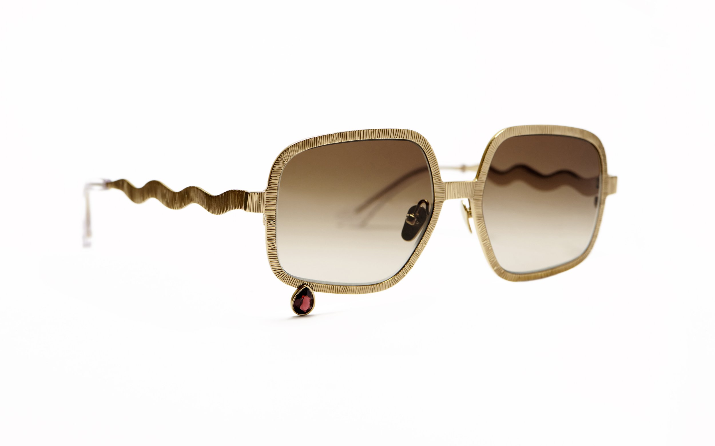 ‘Pentagons’ are limited edition to 300 pieces per stone-lens colour combination. As one of the first two FDL Editions pieces, these unisex ‘Pentagons’ are crafted from gold-plated aeropace-grade titanium, considered a fine and high jewellery material, which is hypoallergenic, ultra-light-weight, and incredibly strong. They feature a 1970s vintage stock coloured-gemstone teardrop motif at front, and an ethically-sourced natural diamond round on the side-temple. The Category 2 lenses are a chic gradient mocha which provide 100% UV protection and crystal-clear vision without distortion. The unisex Pentagons feature a ‘Rigato’ texture, bringing to mind the texture of a silk grosgrain ribbon and paying homage to classic Florentine hand-engraving techniques. Lens-locks on the sides keep the lenses firmly in place, and are easy to unscrew in case you wish to replace the lenses with another colour or prescription lens, as these frames are prescription-ready.